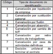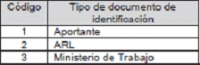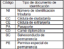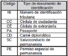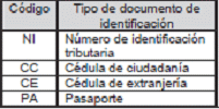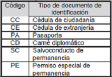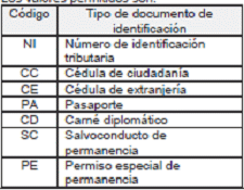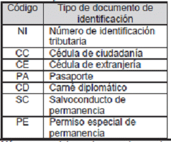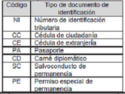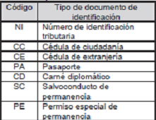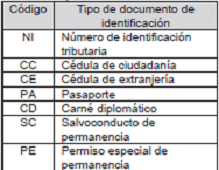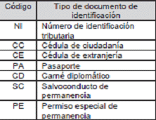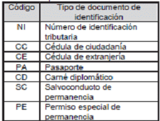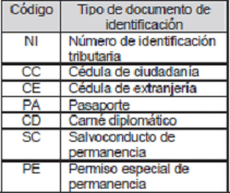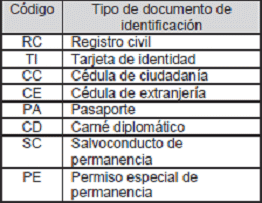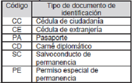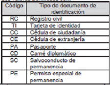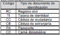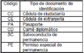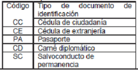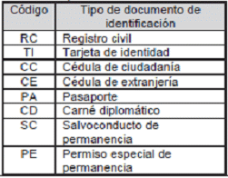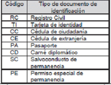 | Código | Nombre tipo de documento de identificación |