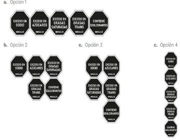 No se puede utilizar otro formato de etiquetado frontal, ni tipo de forma de sello de advertencia, ni cambiar el texto, tipo de letra, diagrama o dibujo, en ningún producto, independiente si lleva o no, etiquetado frontal de advertencia. De igual forma, no se puede utilizar la forma del etiquetado frontal de advertencia para incluir sellos con un texto diferente que haga alusión a otros nutrientes o cualquier componente de los productos envasados diferente a los que son objeto de esta regulación (sal/sodio, azúcares, grasas, edulcorantes)