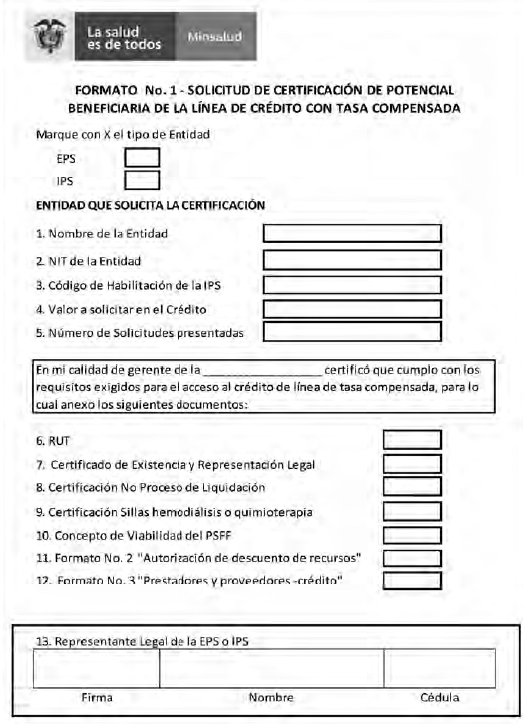 - La entidad que solicita la certificación de posible beneficiario de la línea de crédito deberá diligenciar con una “X” el tipo de Entidad a la que pertenece. En el caso de una EPS, deberá marcar con una “X” en la Opción EPS y en el caso de una IPS, deberá marcar con una “X” en la opción IPS.
