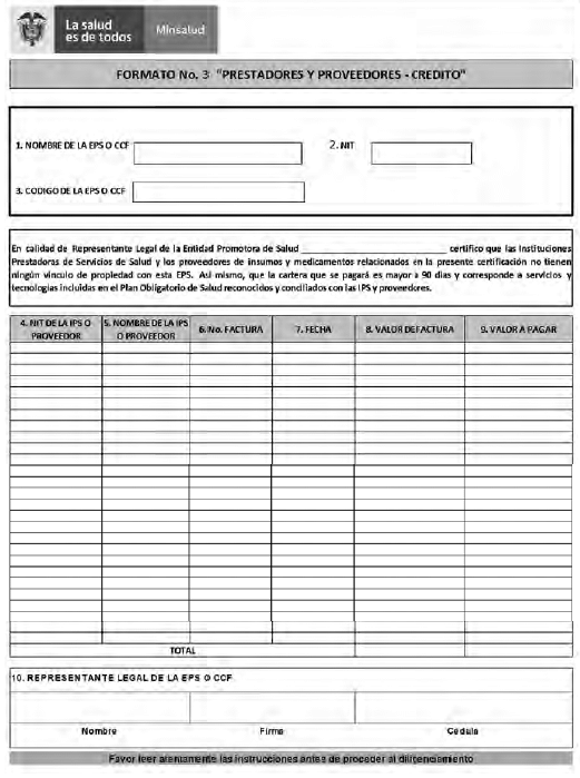 INSTRUCCIONES PARA EL DILIGENCIAMIENTO DEL FORMATO No. 3 “PRESTADORES Y/U PROVEEDORES CRÉDITO”