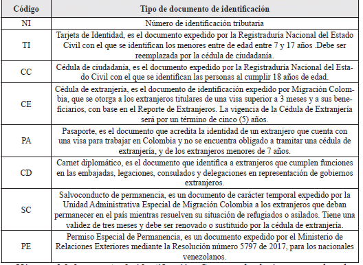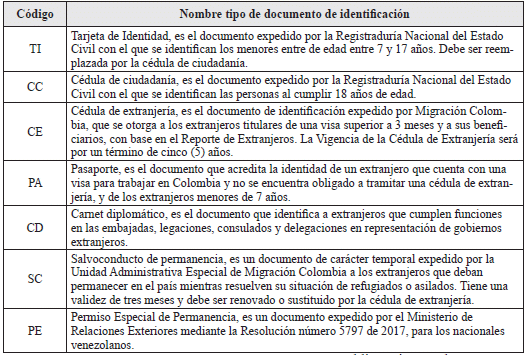Tipo de documento de identificación: Registrar en el espacio el código que corresponde al documento con el cual se va a identificar, de acuerdo con las siguientes opciones: