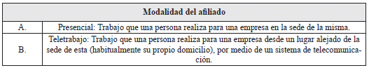 21. Modalidad: Dato obligatorio. Lo suministra el responsable de la afiliación o el afiliado según el caso. Identifique la modalidad del trabajo que realiza el afiliado y marque con X, según corresponda:
