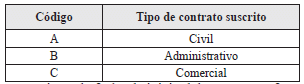 28. Tipo de Contrato Suscrito: Dato obligatorio. Seleccione y escriba el código según corresponda al tipo de contrato que fue suscrito de acuerdo con las siguientes opciones: