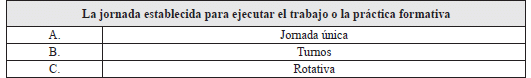 39. Jornada establecida: Seleccione y marque con X la jornada establecida para ejecutar el trabajo o la práctica formativa, de acuerdo con las siguientes opciones:
