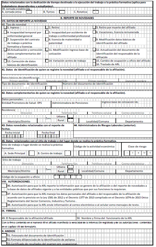 "FORMULARIO ÚNICO DE AFILIACIÓN Y REPORTE DE NOVEDADES DE TRABAJADORES, CONTRATISTAS Y ESTUDIANTES AL SISTEMA GENERAL DE RIESGOS LABORALES".