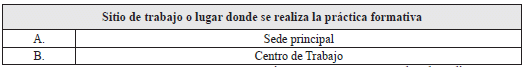 22. Sitio de trabajo o lugar donde se realiza la práctica formativa: Dato obligatorio. Lo suministra el afiliado. Seleccione y marque con una X el sitio de trabajo o lugar donde se realiza la práctica formativa, según corresponda:
