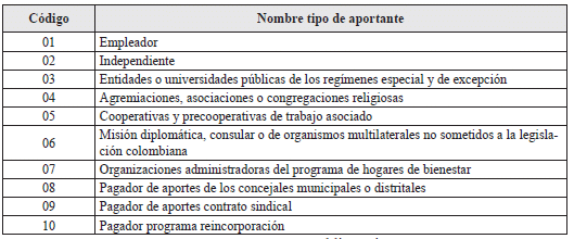 3. Tipo de aportante: Dato obligatorio. Lo suministra quien realiza la afiliación. Identifique el tipo de afiliado y escriba el código correspondiente de acuerdo con las siguientes opciones: