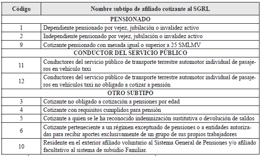 Otro Subtipo: Hace referencia a los afiliados cotizantes que por mandato legal o reglamentario se les reconoce una condición especial para afiliarse y cotizar al SGRL de acuerdo con las características individuales de tal condición.