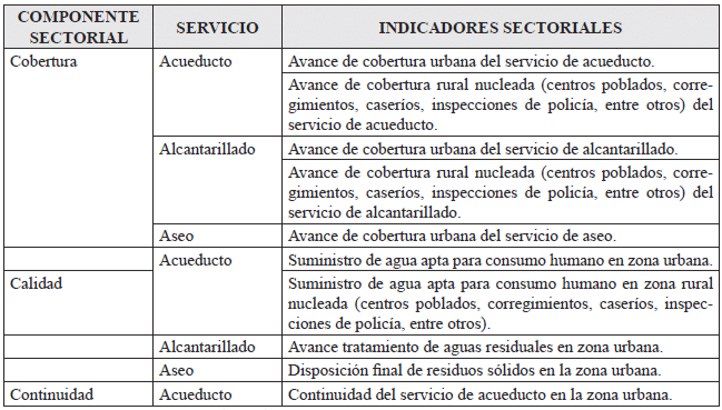 “Artículo 5o. Indicadores estratégicos para el monitoreo de los recursos del Sistema General de Participaciones para Agua Potable y Saneamiento Básico. Son aquellos que permiten verificar los indicadores de cobertura, calidad y continuidad, en la prestación de los servicios públicos de agua potable y saneamiento básico, a través de los cuales se identifican acciones u omisiones de los municipios y distritos, frente a la prestación de dichos servicios.