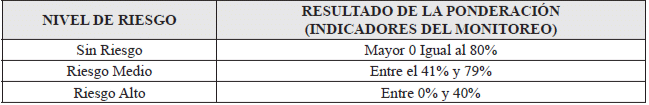 “Artículo 7o. Nivel de riesgo. La aplicación de lo dispuesto en el artículo anterior, determinará el nivel de riesgo del monitoreo en el que se encuentra la entidad territorial, así: