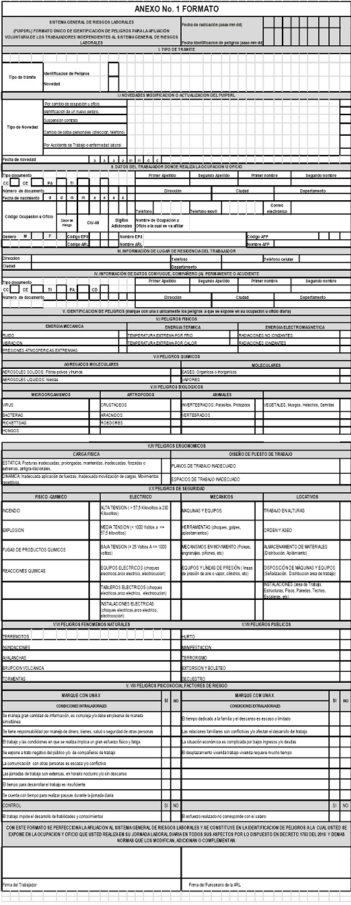 | Formato Único de Identificación de Peligros para la afiliación voluntaria de los trabajadores independientes que devenguen uno (1) o más salarios mínimos mensuales legales vigentes al Sistema General de Riesgos Laborales | FUIPSRL |