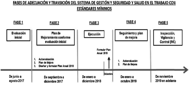 ARTÍCULO 25. FASES DE ADECUACIÓN, TRANSICIÓN Y APLICACIÓN PARA LA IMPLEMENTACIÓN DEL SISTEMA DE GESTIÓN DE SST CON ESTÁNDARES MÍNIMOS. Las fases de adecuación, transición y aplicación para la implementación del Sistema de Gestión de SST con Estándares Mínimos, que deben adelantar los empleadores y contratantes y que se encuentran en proceso de desarrollo son: