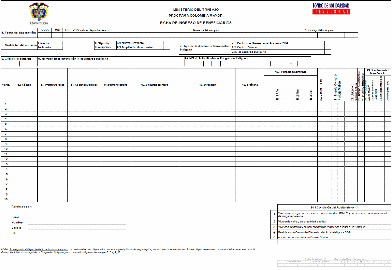 14 | Procesamiento de información para validación de ingreso al Programa de Protección Social al Adulto Mayor hoy Colombia Mayor. | Administrador Fiduciario | Validación Base de datos y documentos digitalizados | ||