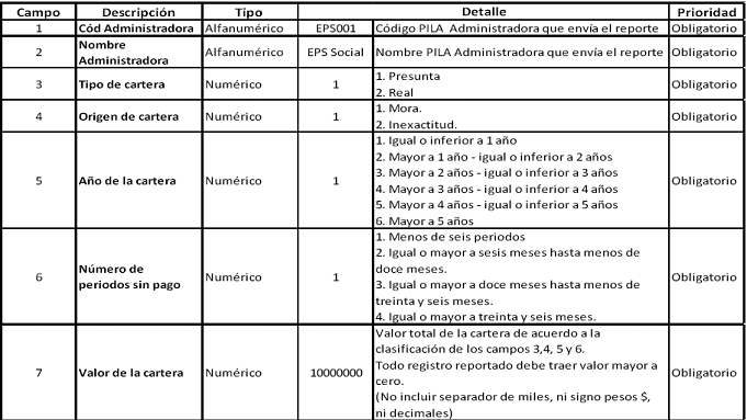 Reporte desagregado de Cartera: El reporte desagregado de cartera corresponde a la deuda identificada por aportante, incluyendo datos adicionales como: 1) el número de periodos sin pago; 2) tipo de cartera; 3) origen de la cartera; 4) última acción de cobro adelantada, etc. Corresponde al total de la cartera identificada por la administradora con incumplimiento igual o superior a treinta (30) días calendario a la fecha de corte y reportada en los meses de enero, abril, julio y octubre de cada año.