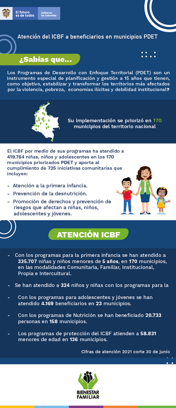 Conoce cómo, en cumplimiento de los compromisos establecidos en el Acuerdo de Paz, el Instituto Colombiano de Bienestar Familiar (ICBF) ha atendido a 419.764 niñas, niños y adolescentes en los 170 municipios que fueron priorizados para implementar los Programas de Desarrollo con Enfoque Territorial (PDET), orientando esfuerzos para garantizar los derechos de la niñez y la adolescencia.