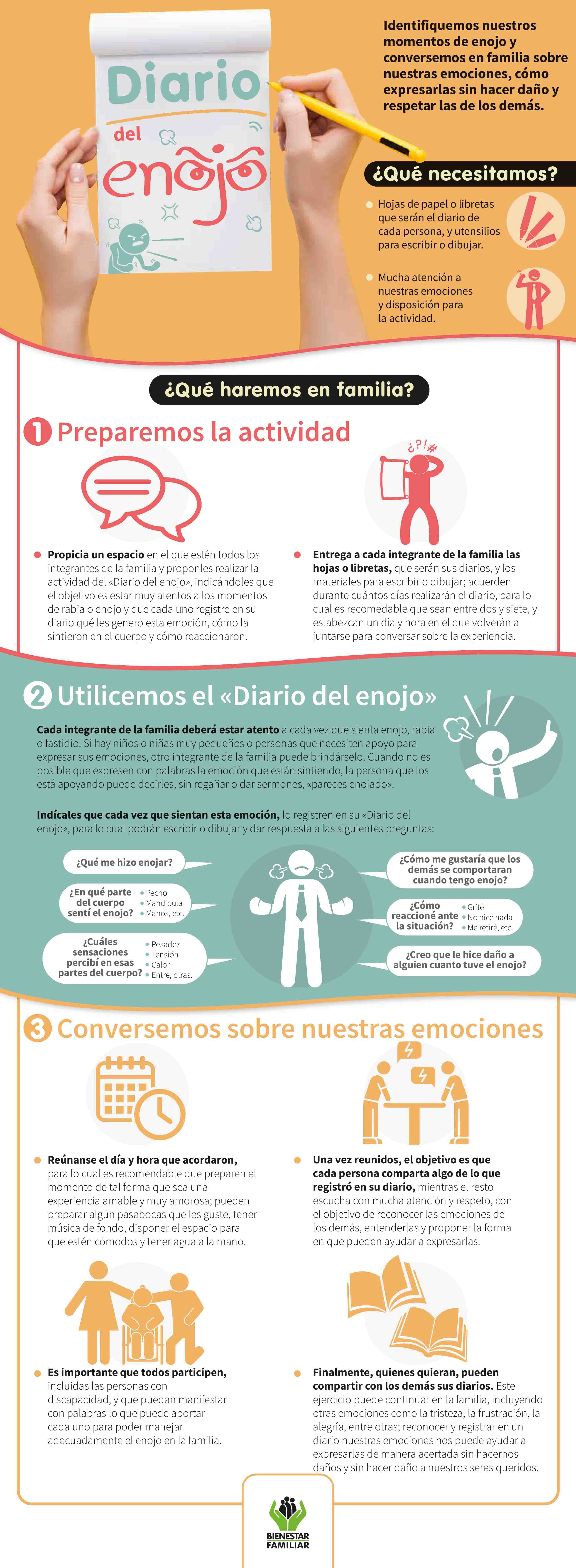 Una de nuestras emociones básicas es el enojo, que es una reacción natural para expresar nuestro desacuerdo o molestia ante algunas situaciones. Es importante saberlo manejar, dado que la forma como lo expresamos puede tener un impacto en nuestras relaciones interpersonales; por ejemplo, cuando estamos enojados, podemos comunicarnos con un lenguaje inapropiado, con comportamientos y movimientos corporales fuertes que pueden herir a los otros y no trasmitir la razón de nuestro enojo. Por tal motivo, en Mis Manos Te Enseñan proponemos la actividad del «Diario del enojo», para aprender a reconocerlo y expresarlo adecuadamente.