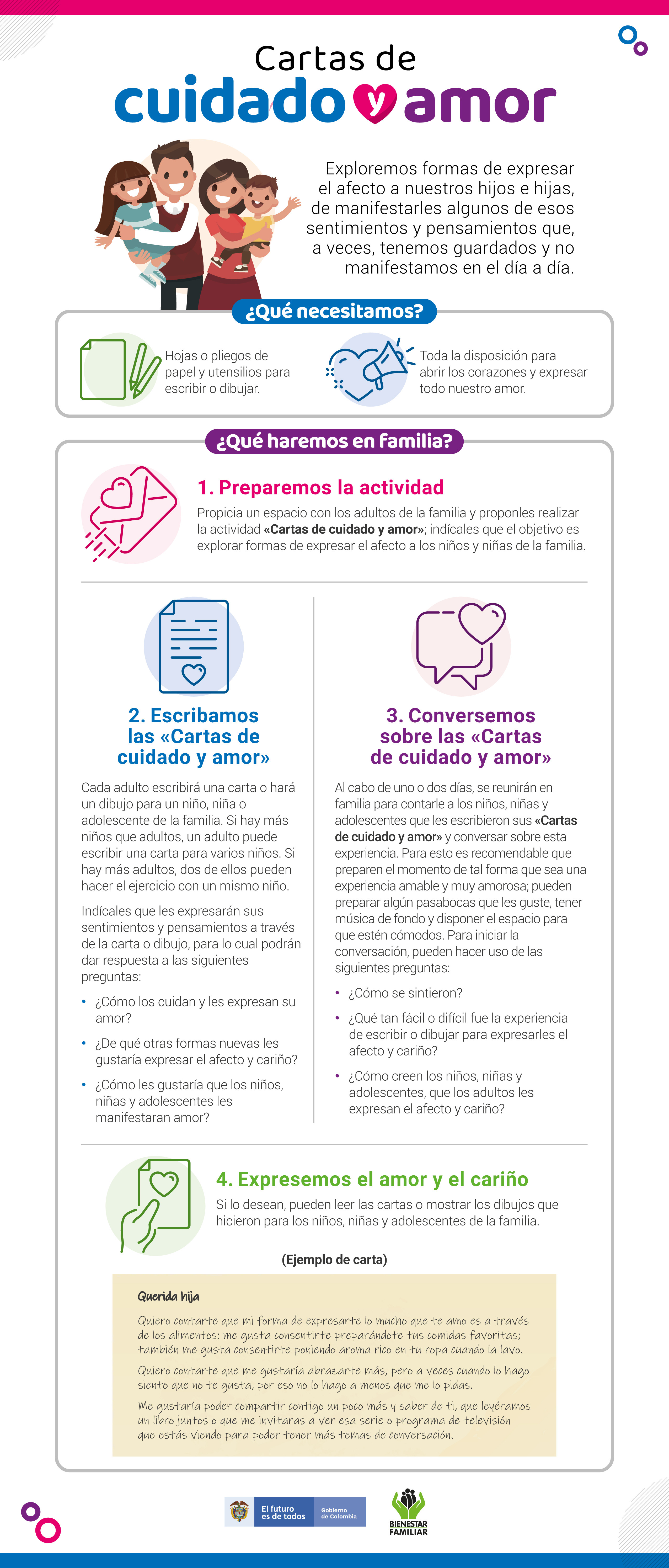 Jugar, leer, salir al parque, cocinar, conversar, cuidar animales o cultivar plantas con ellas y ellos, entre otras tantas actividades cotidianas, además de permitirnos crear espacios de confianza y relaciones cercanas, genuinas y seguras, nos abre la posibilidad de descubrir sus necesidades, intereses, expectativas, capacidades, miedos e incertudimbres, a partir de las cuales construiremos vínculos de cuidado. Si, adicionalmente, les expresamos asertivamente nuestro amor, impulsaremos su desarrollo. Por eso, en Mis Manos Te Enseñan les proponemos la actividad de «Cartas de cuidado y amor», como posibilidad para explorar otras formas de conexión y deseguir fortaleciendo el vínculo de amor y cuidado.