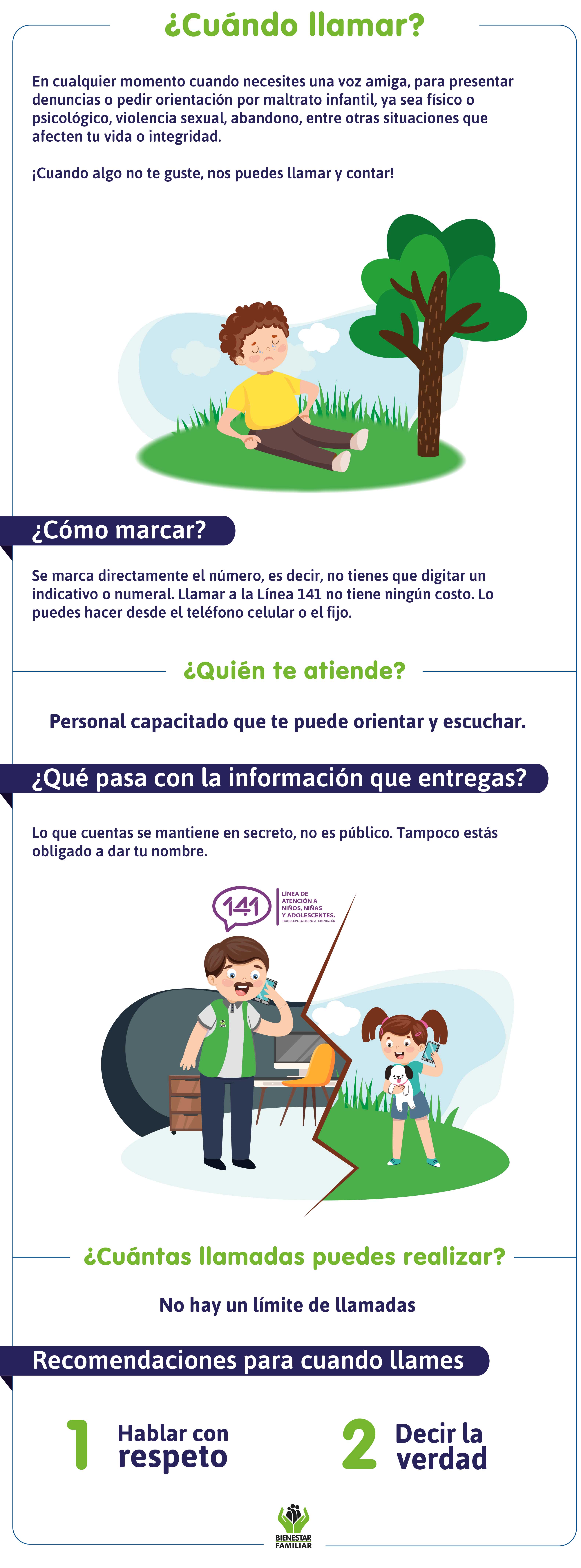 La Línea 141 es un canal de servicio al que pueden acudir todos los niños, niñas y adolescentes de Colombia cuando estén en riesgo o hayan sido vulnerados sus derechos. Allí siempre los atenderán personas en quienes pueden confiar.