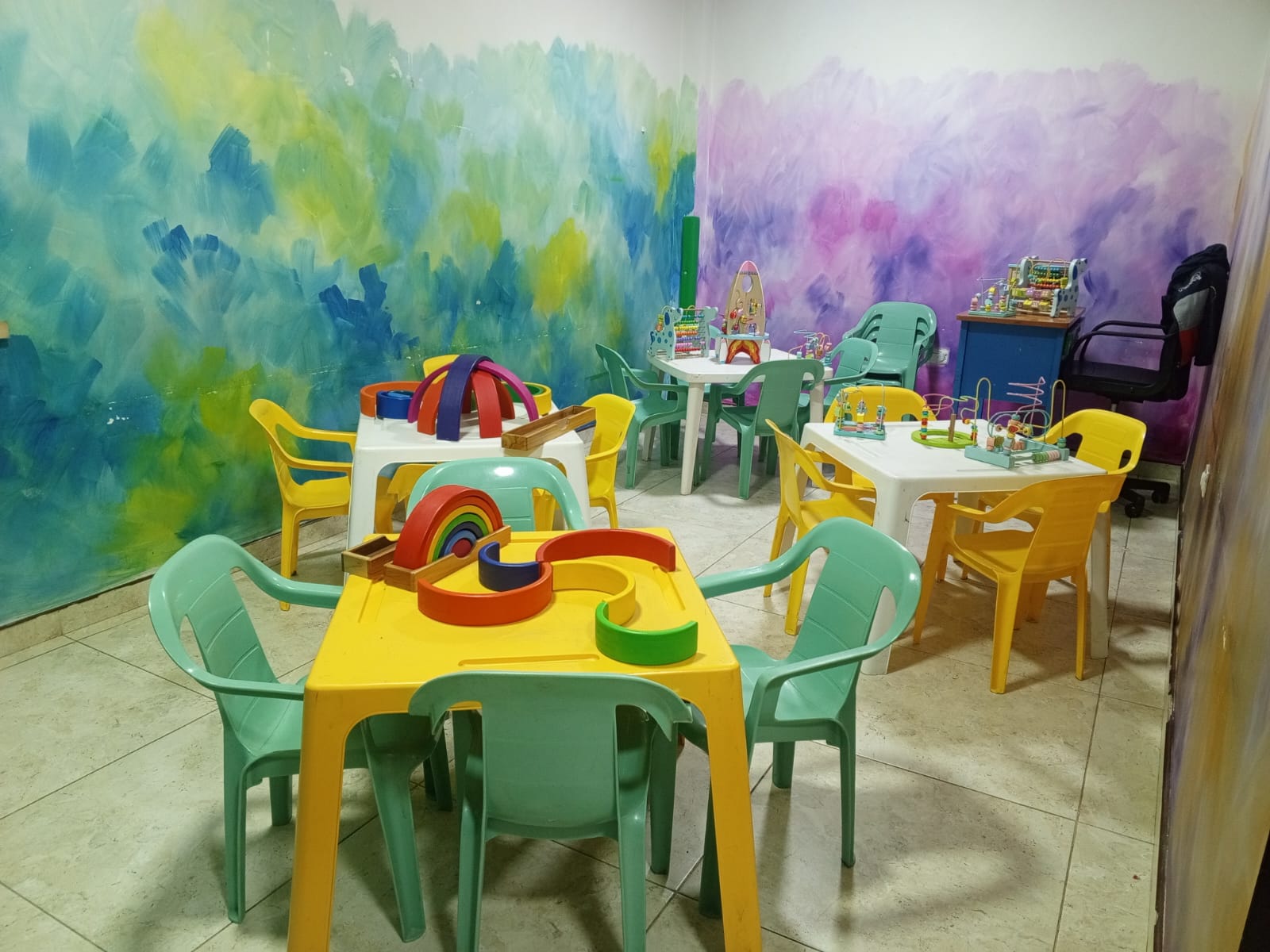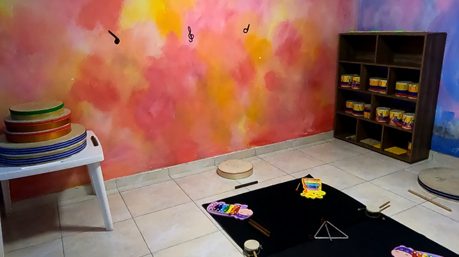 A pocos metros, otra aula se convierte en un teatro improvisado donde títeres y marionetas esperan pacientes su turno en «cartelera». Las sillas pequeñas, cuidadosamente ordenadas, están listas para recibir a sus espectadores. En otra sala, la música llena el ambiente mientras niñas y niños se mueven de distintas formas y bajo indicaciones que invitan a nuevos movimientos, fortaleciendo así su coordinación y bienestar emocional.