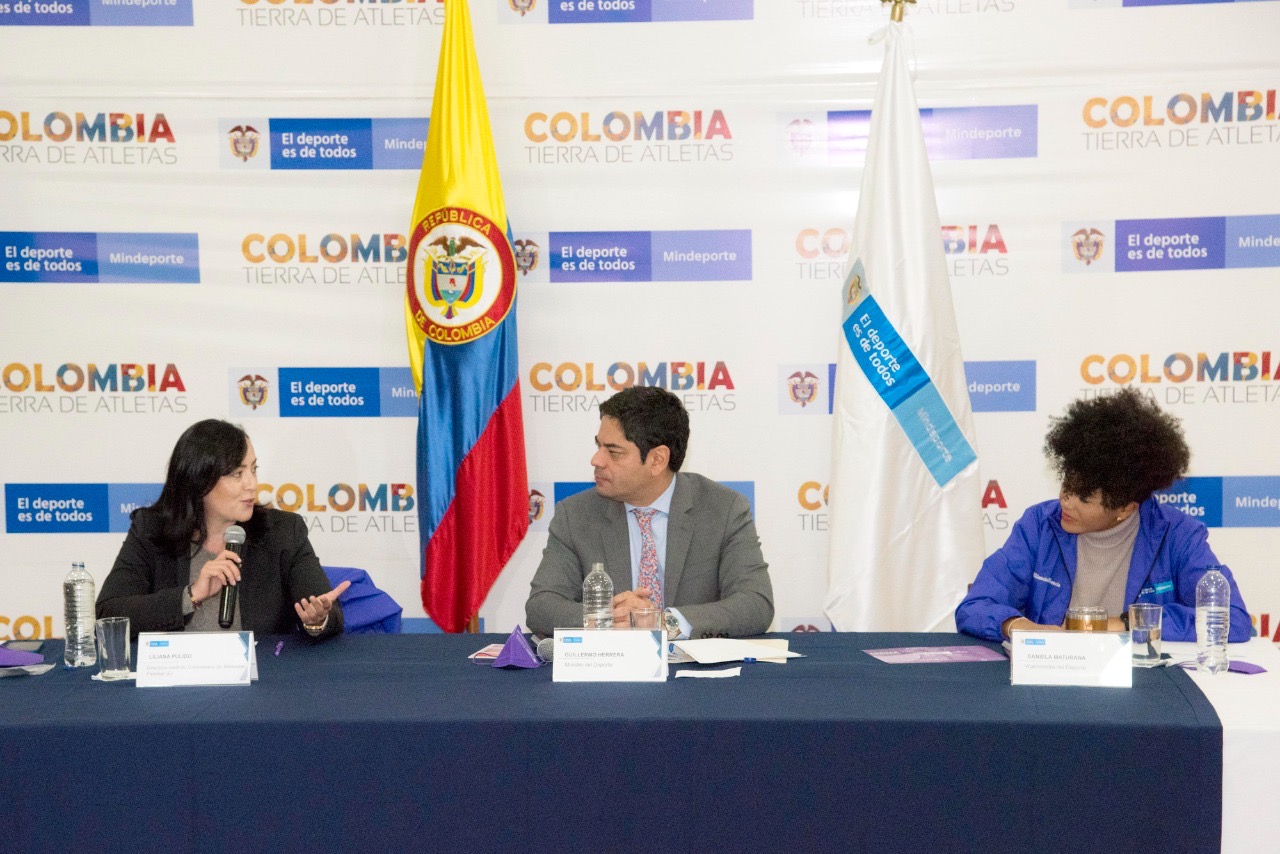 El Ministro del Deporte, Guillermo Herrera junto con la Directora General (e) del Instituto Colombiano de Bienestar Familiar (ICBF), Liliana Pulido Villamil, y la Viceministra del Deporte, Daniela Maturana, lanzaron la Línea Gratuita 01 8000 114060 ´Ni Silencio Ni Violencia´ para la prevención, atención y erradicación de las violencias basadas en género en el ámbito deportivo.