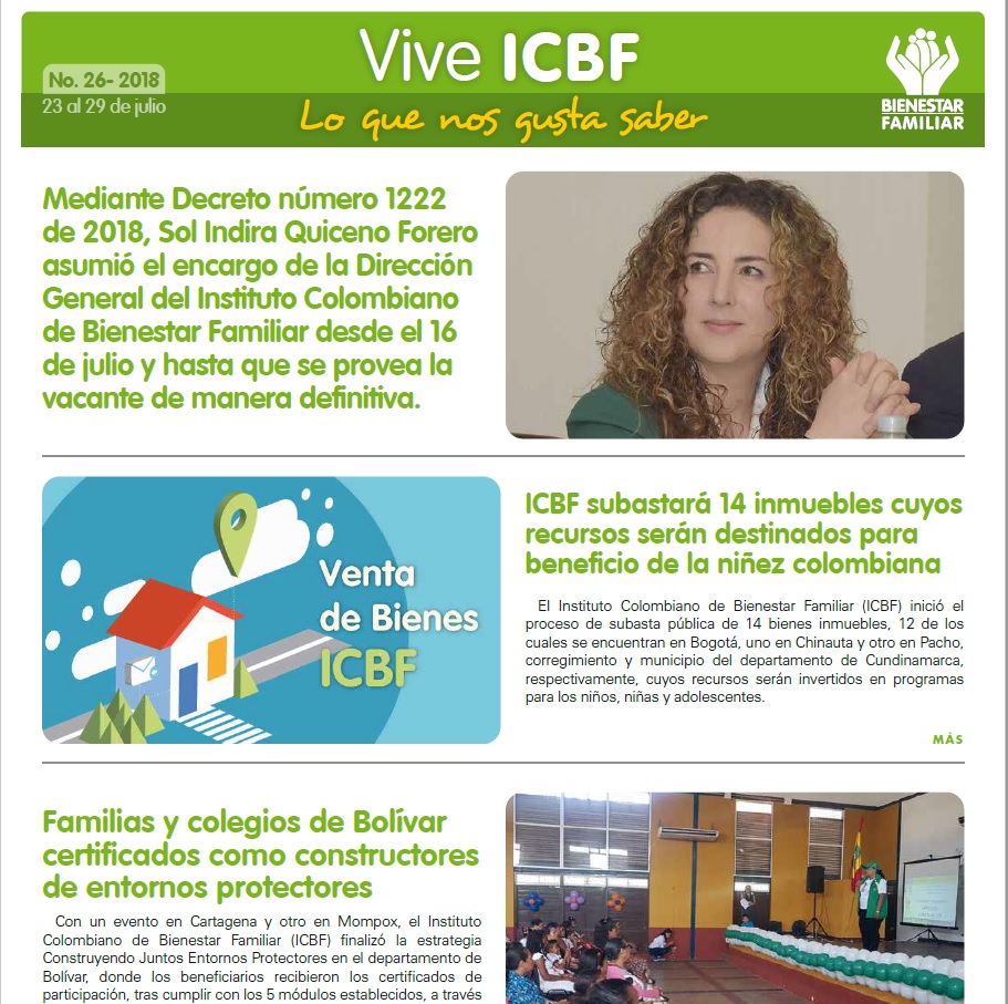 Boletín Vive ICBF No. 26 Documento Boletín Vive ICBF No. 26 Imagen de listado Fecha Lunes, Julio 23, 2018 - 11:30 Categoría del archivo Publicaciones Vive ICBF Fecha fijación Lunes, Julio 23, 2018 - 11:30 Fecha desfijación Martes, Julio 23, 2019 - 11:30 Lee más sobre Boletín Vive ICBF No. 26